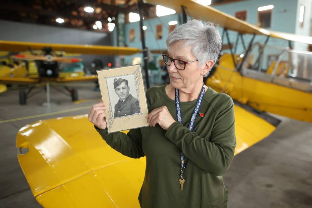 Lisa Duttun, volunteer collections and archives researcher at the Commonwealth Air Training Plan Museum, holds a photo of Pilot Officer George Roy Bullion in front of a Tiger Moth aircraft, similar to ones he trained on, at the museum on Thursday. A new exhibit titled “From Brandon To Burma” showcases the life of Bullion, who served in the Second World War between 1941 and his death in 1944. (Photos by Tim Smith/The Brandon Sun)