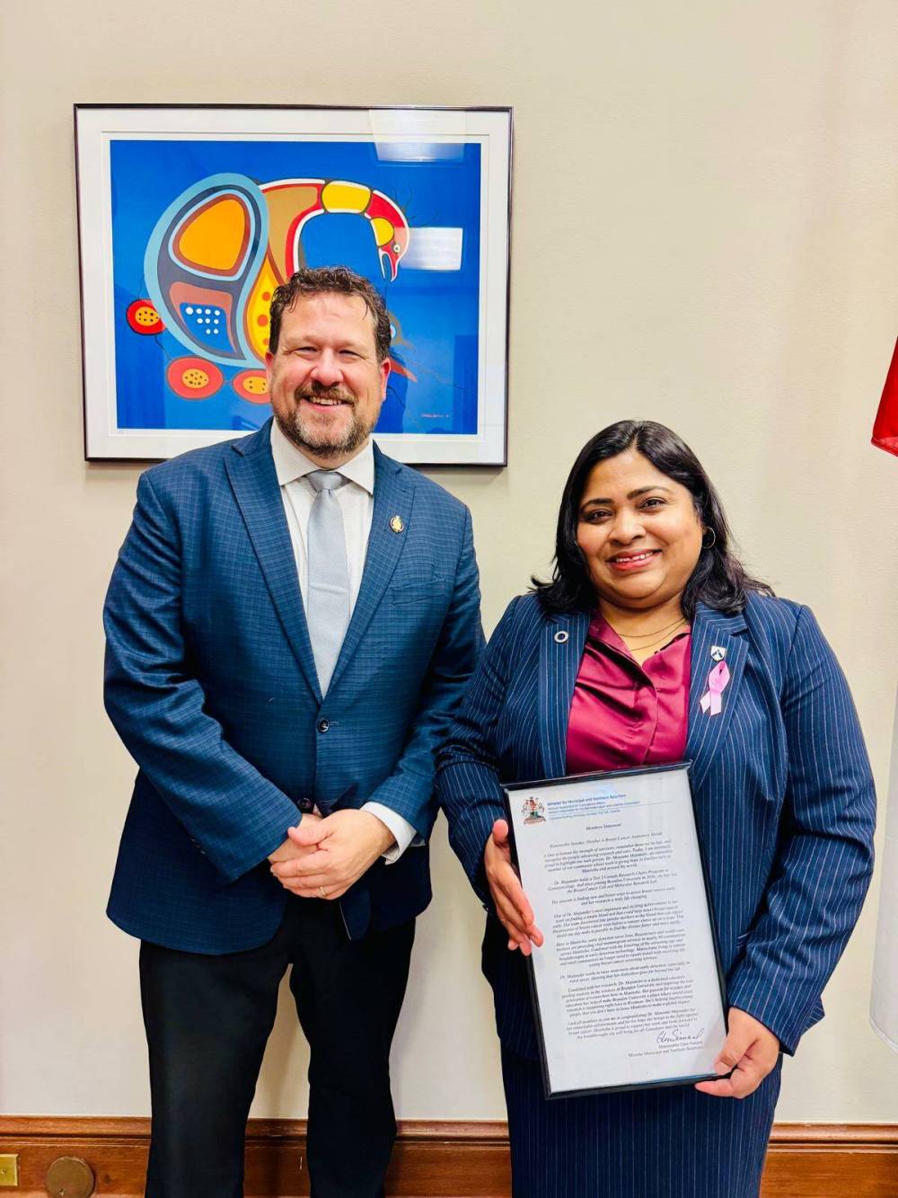 The recognition came through a Member’s Statement by Brandon East MLA Glen Simard, who highlighted Majumder’s contributions during Breast Cancer Awareness Month.