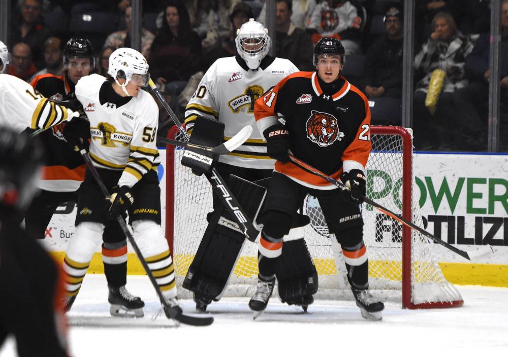 Brandon Wheat Kings goaltender Filip Ruzicka (30) looks around a screen by Medicine Hat Tigers forward Kade Stengrim (21) during a Nov. 8 game. The Wheat Kings take on the Tigers again at Assiniboine Credit Union Place on Saturday. (Medicine Hat News)