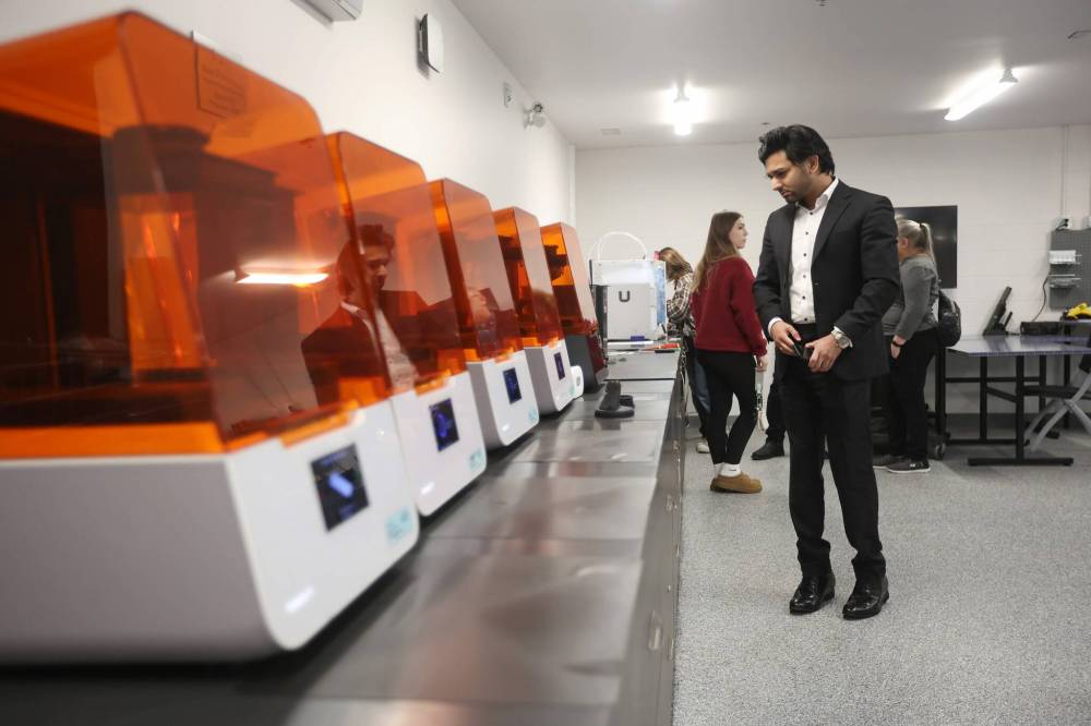 Guests tour some of the equipment available for use at Assiniboine College’s new Creative CoLab during the opening of the space at the Victoria Avenue East campus on Thursday. (Tim Smith/The Brandon Sun)