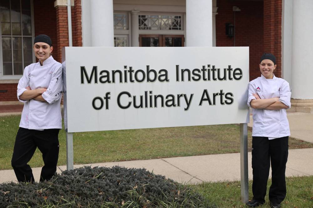 Assiniboine College culinary arts students Alicia Decosse (right) and Presley Kuharski stand by the Manitoba Institute of Culinary Arts sign on Friday afternoon. The students were named the top new student chefs in Canada after they won gold at the 2025 Cooks the Books national student cooking competition in Toronto last week. (Abiola Odutola/The Brandon Sun)