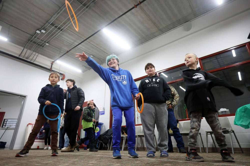 Mason Myers-Sawatzky plays hoop toss with friends during the holiday celebration on Friday. (Tim Smith/The Brandon Sun)