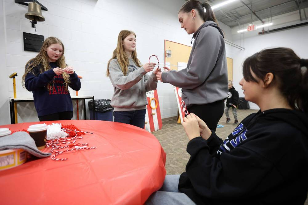 Meygan Bishop, Teyah Branconier, Chloe Kent and Summer Gillis of Rivers Collegiate make pipe-cleaner candy canes while volunteering at Friday’s event. (Tim Smith/The Brandon Sun)