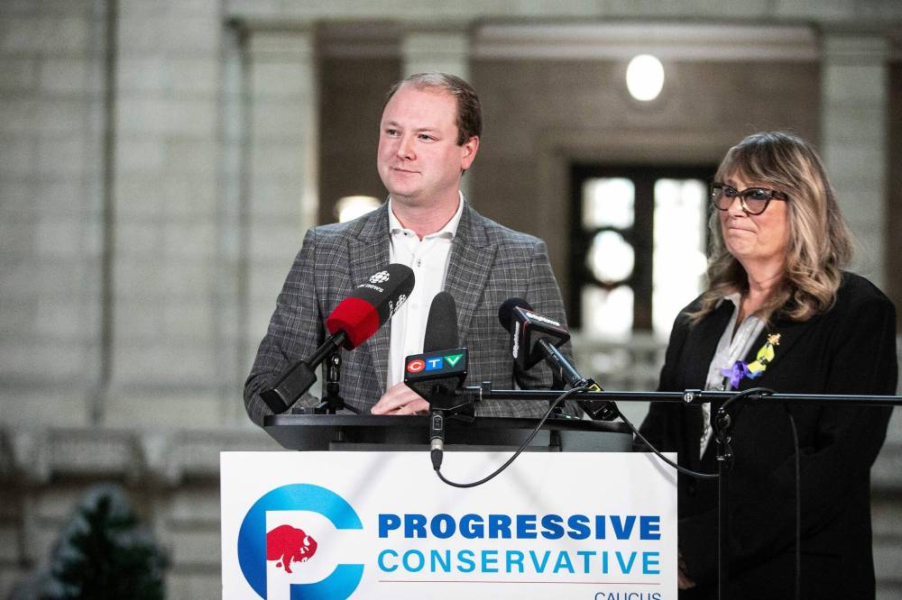 Brandon-Souris MP Grant Jackson (left) and Spruce Woods MLA Colleen Robbins speak to the media at the legislature on Friday, advocating for the funding of Bray’s medication. (Mikaela MacKenzie/Winnipeg Free Press)