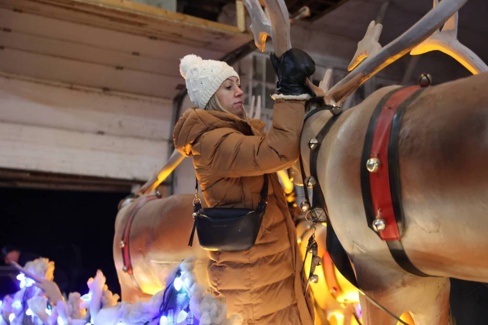 Brandon Santa Parade chair Ashleigh Hamm makes adjustments to a reindeer’s harness on the Santa and Mrs. Claus float at the Keystone Centre on Friday evening. (Abiola Odutola/The Brandon Sun)