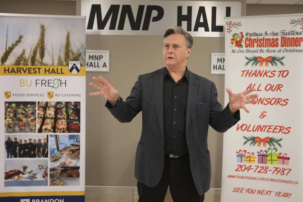 Media relations director Frank McGwire speaks during the traditional Christmas dinner at the Keystone Centre in 2023. The event will be held this year at the Victoria Inn. (Tim Smith/The Brandon Sun files)