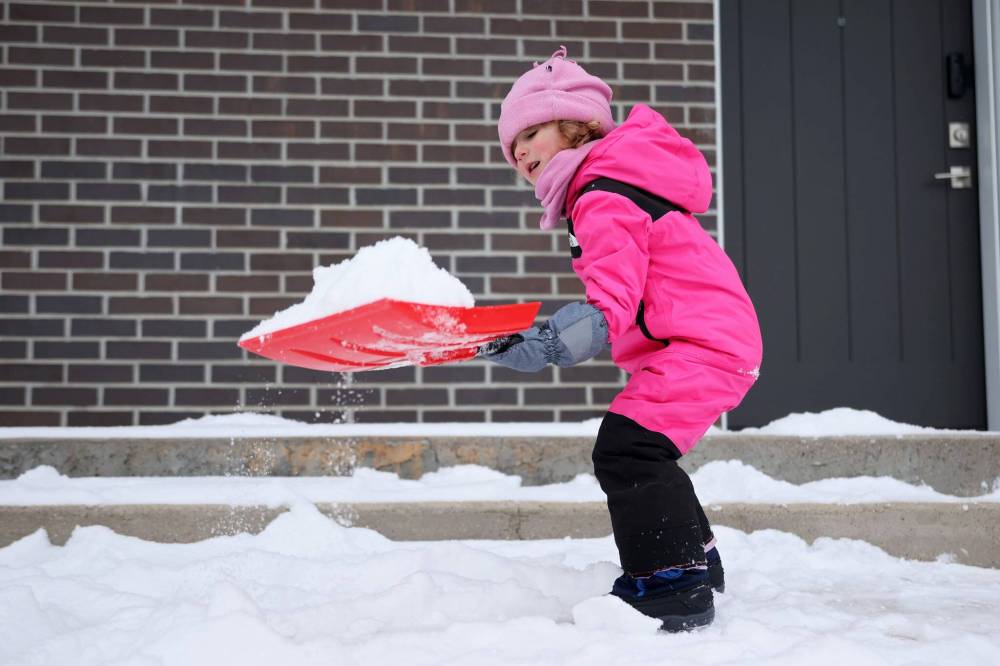 Three-year-old Aaliyah works hard to clear snow outside her family's home in Brandon on Monday afternoon after the Wheat City received fresh snow earlier in the day. According to Environment Canada, Brandon is under a winter storm watch for Tuesday. (Tim Smith/The Brandon Sun)