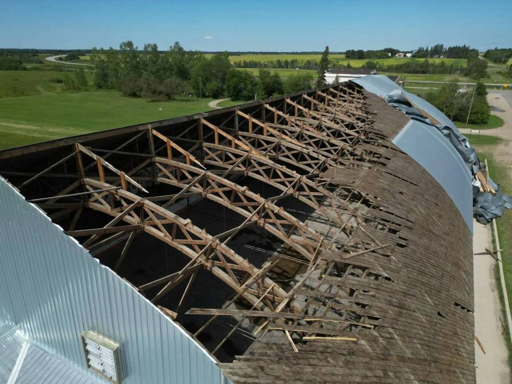 A large portion of the Foxwarren Arena was exposed after an August 2024 wind storm ripped off sections of the roof. (Tim Smith/The Brandon Sun files)