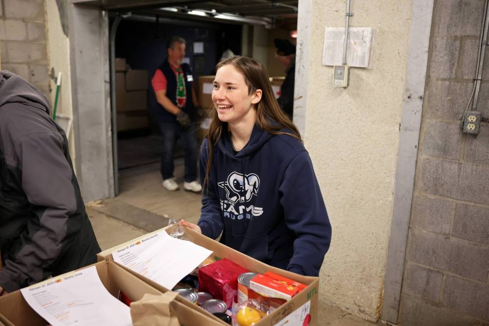Amanda Mielke with the Brandon University Women’s Rugby Team helps move Christmas to the loading bay.