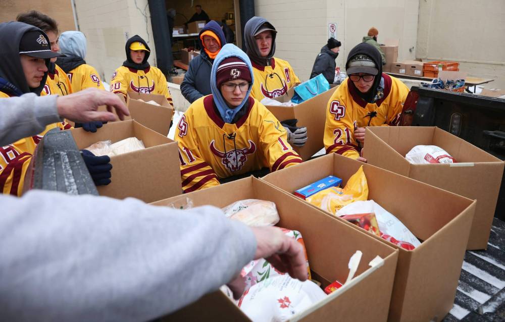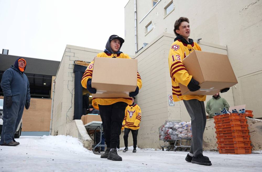 Volunteers, including members of the Crocus Plainsmen hockey team, help load Christmas hampers for delivery at the Brandon-Westman Christmas Cheer Registry on Seventh Street on Wednesday afternoon. This year, 1,710 Brandon families registered for Christmas Cheer hampers, an increase from the 1,551 who registered last year. Deliveries are set to continue today.