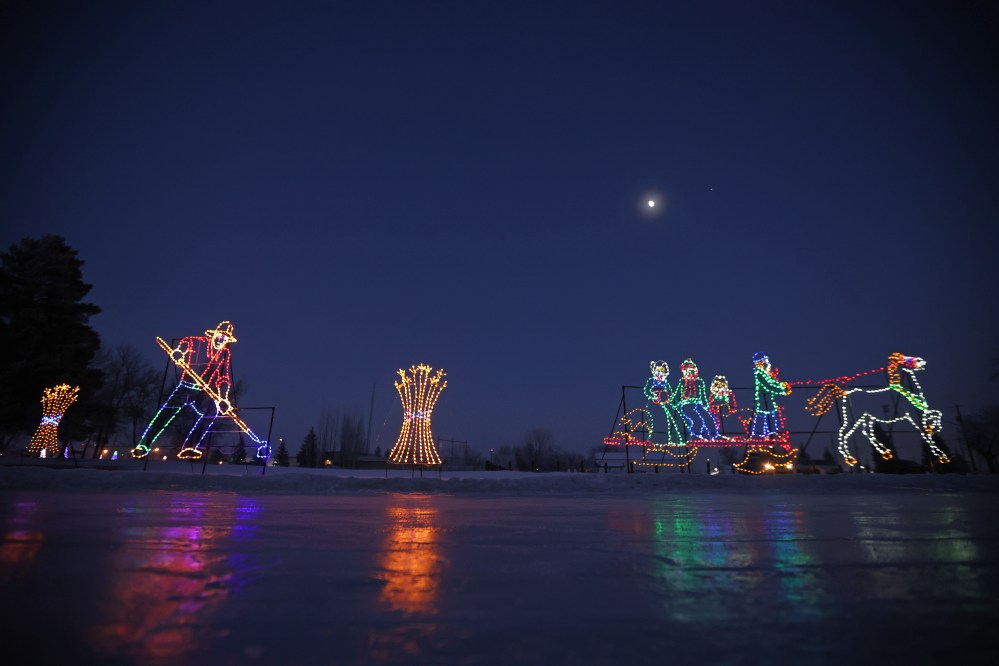 The lights on display at the Brandon Skating Oval are reflected in the ice as the moon rises in this photo taken in December 2023. The lights are now on for this year's skating season. (File)