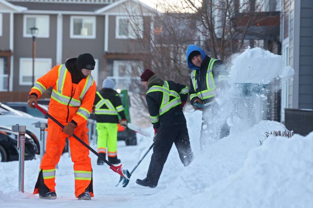 Bundled-up workers clear snow from the sidewalks at The Groves in Brandon’s south end on a cold Thursday afternoon.