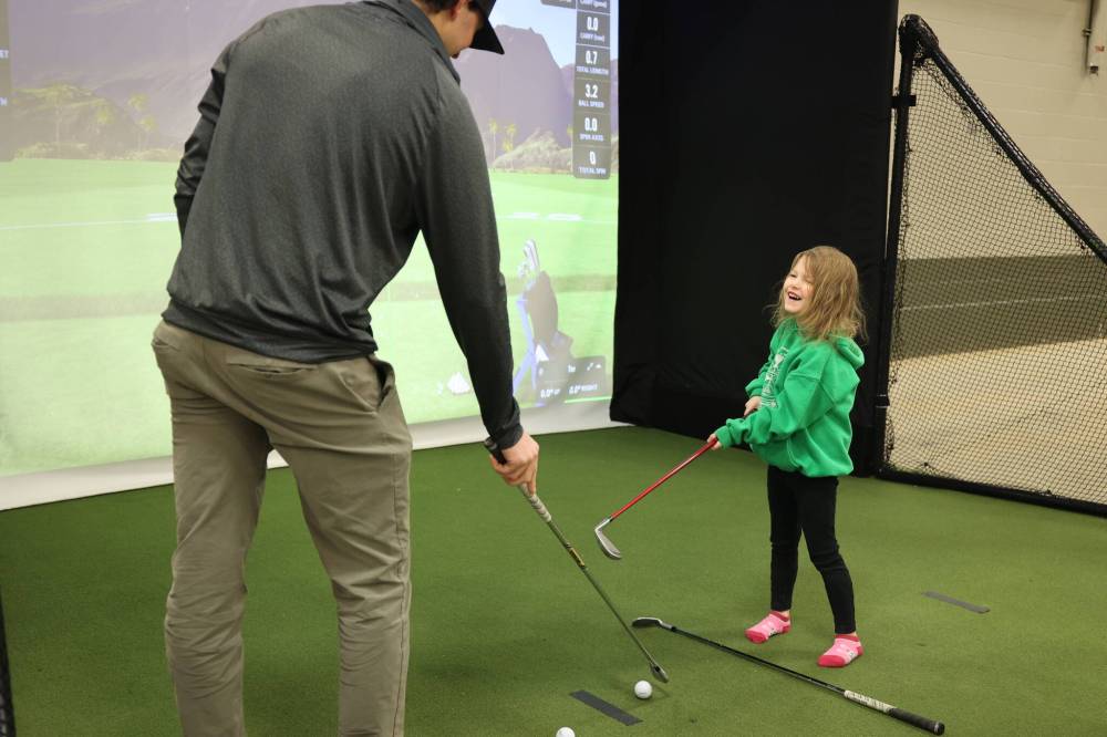 Navaeh Damielson, 4, plays the golf simulator.