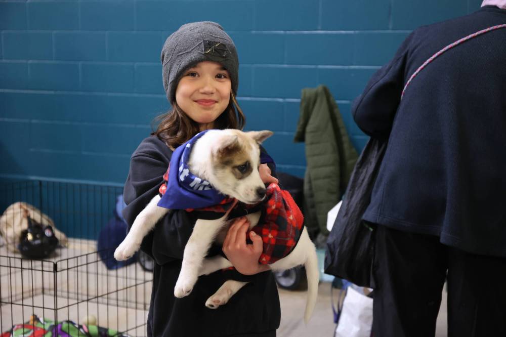 Jovia Taggart, 9, holds a puppy during Family Fun Day. RIGHT: Navaeh Damielson, 4, plays the golf simulator.