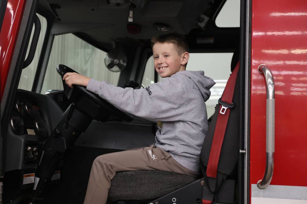 BELOW: Octavius Egan sits in a fire truck in a “touch-a-truck” area at Family Fun Day.