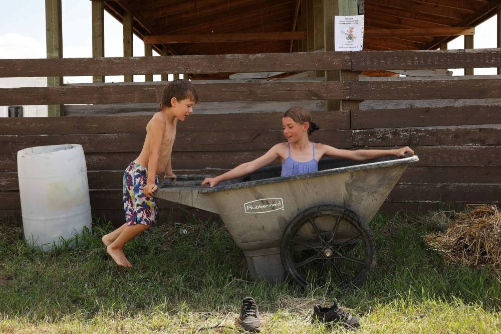 Lane McLeod of Miniota and Ruby McAuley of Rocanville, Sask., cool down in a livestock wheelbarrow filled with water on a hot day at the Harding Fair in July. (Photos by Tim Smith/The Brandon Sun)
