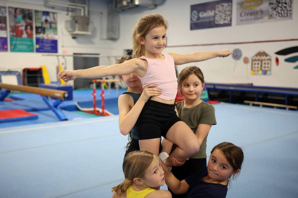 Sunday’s practices fly by in a tight, one-hour window that barely leaves time to breathe, with conditioning and dynamic stretching before getting into focused routines and stunts, and then ending it off with games and a cool-down. With many athletes still new to the sport, Gray and Ross stay on the floor demonstrating skills and pushing conditioning alongside them, spotting closely as stunts go up and reminding everyone results don’t come right away.