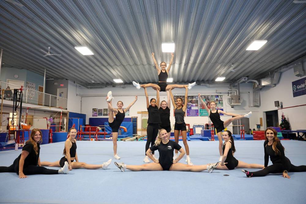 Coaches Kristina Ross (left) and Larissa Gray (right) and members of the Velocity Cheer U16 cheer team in practice at Brandon Eagles Gymnastics in early December.