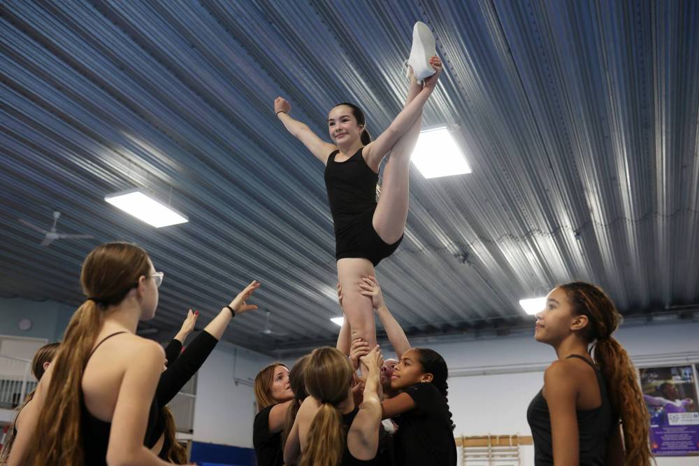Brandon’s Phoenix Martin, a 13-year-old on the U16 stunt team, is also trying to get on perfect timing.