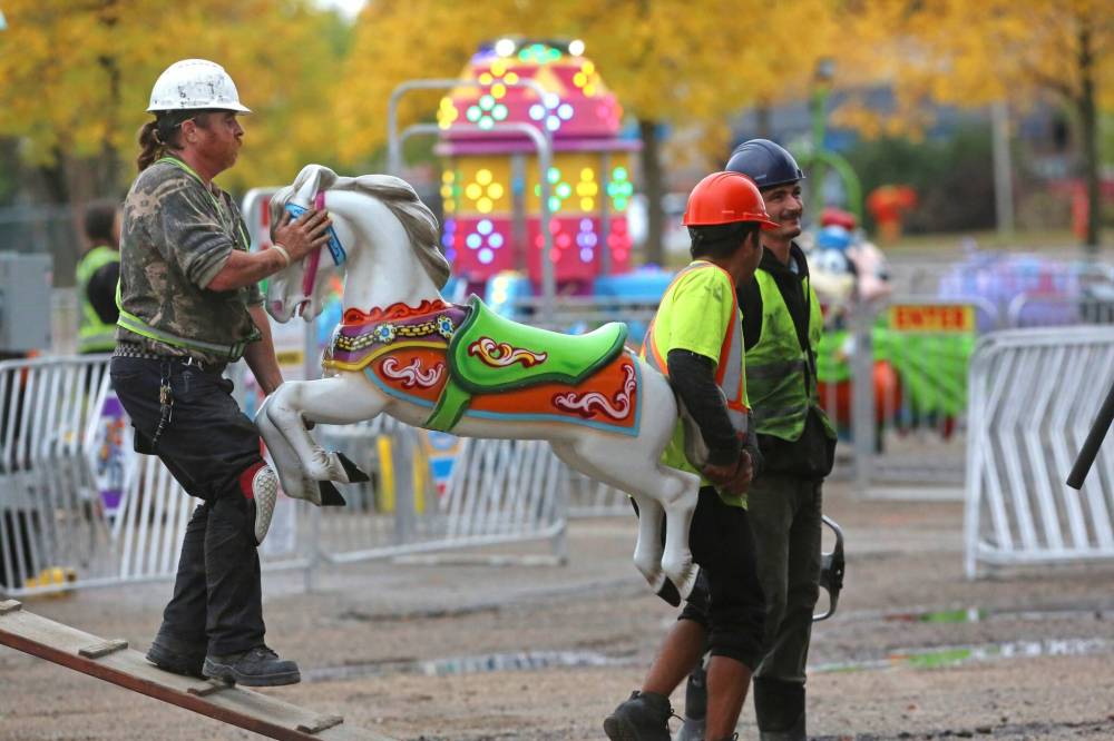 A work crew with Select Shows unloads one of 30 carousel horses during an afternoon midway set up in September. This image has been selected by Brandon Sun editor Matt Goerzen as among the best he snapped in 2025. (Photos by Matt Goerzen/The Brandon Sun)