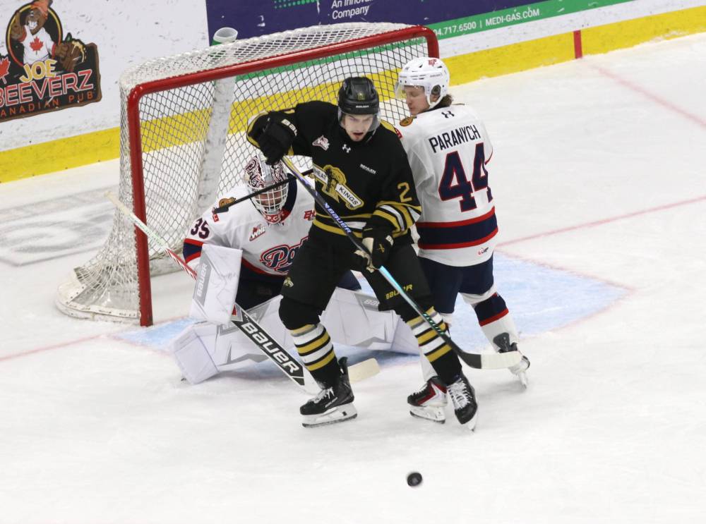 Regina Pats goaltender Marek Schlenker keeps his eyes on the puck as Brandon Wheat Kings forward Jimmy Egan and Pats defenceman Matt Paranych tie up in front during Western Hockey League action at Assiniboine Credit Union Place in November. The Wheat Kings host the Pats on Saturday night. (Perry Bergson/The Brandon Sun files)