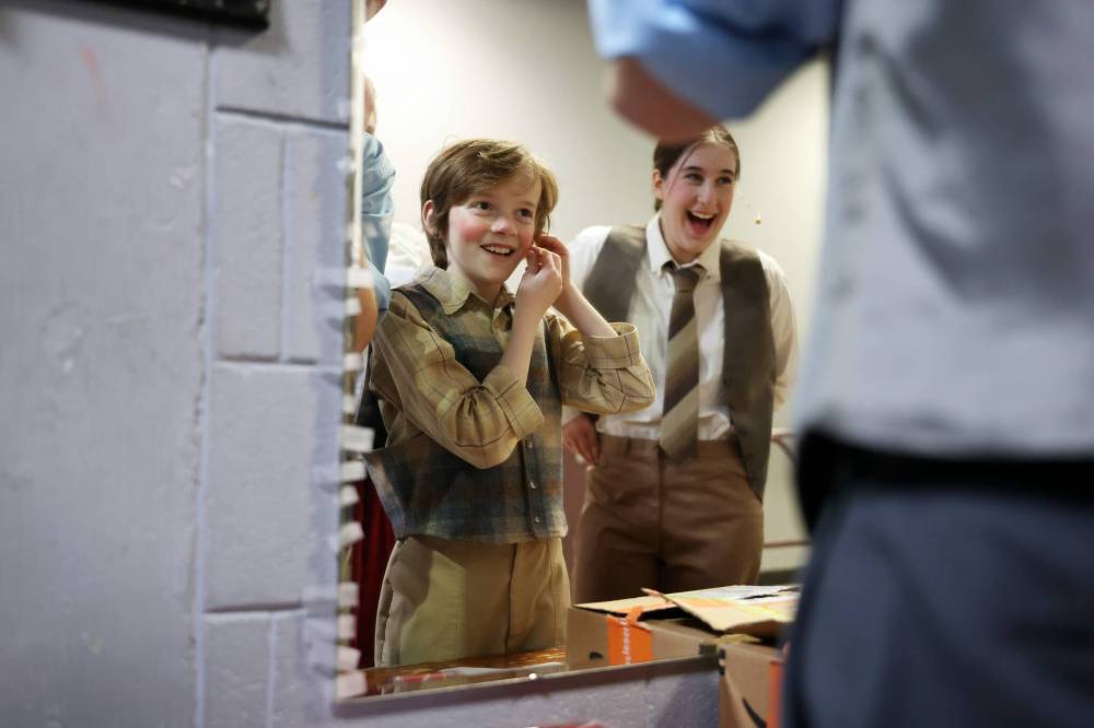 Judah Thiessen (left) with the cast of Westman Drama Ministries’ presentation of “Newsies Jr.” prepares backstage with fellow cast members before the dress rehearsal at the Western Manitoba Centennial Auditorium in Brandon on Thursday evening.