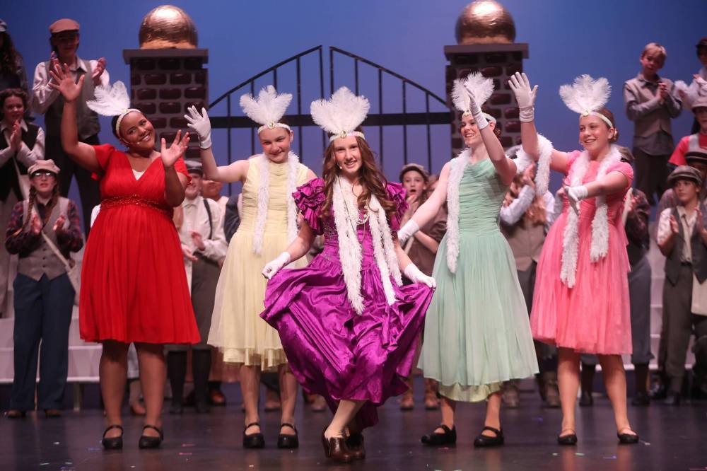 It’s not all drab in the world of “Newsies Jr.,” as this colourfully costumed scene attests.