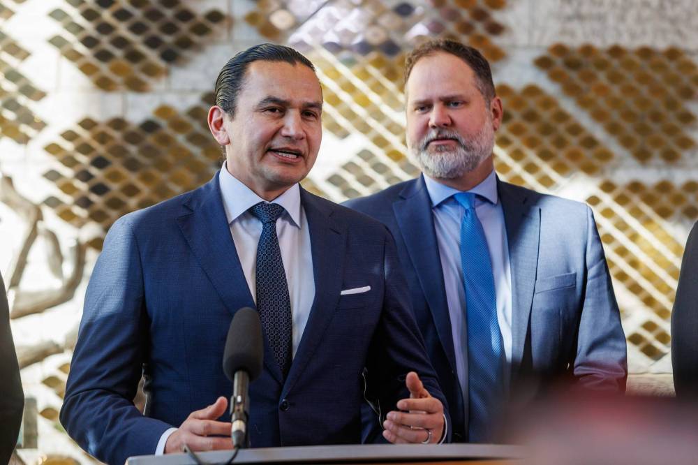 Premier Wab Kinew, with Justice Minister Matt Wiebe on the right, announces the launch of a security enhancement fund to protect places of worship against hate crimes during a press conference at the Shaarey Zedek Synagogue on Wellington Crescent in Winnipeg on Monday. (Mike Deal/Winnipeg Free Press)
