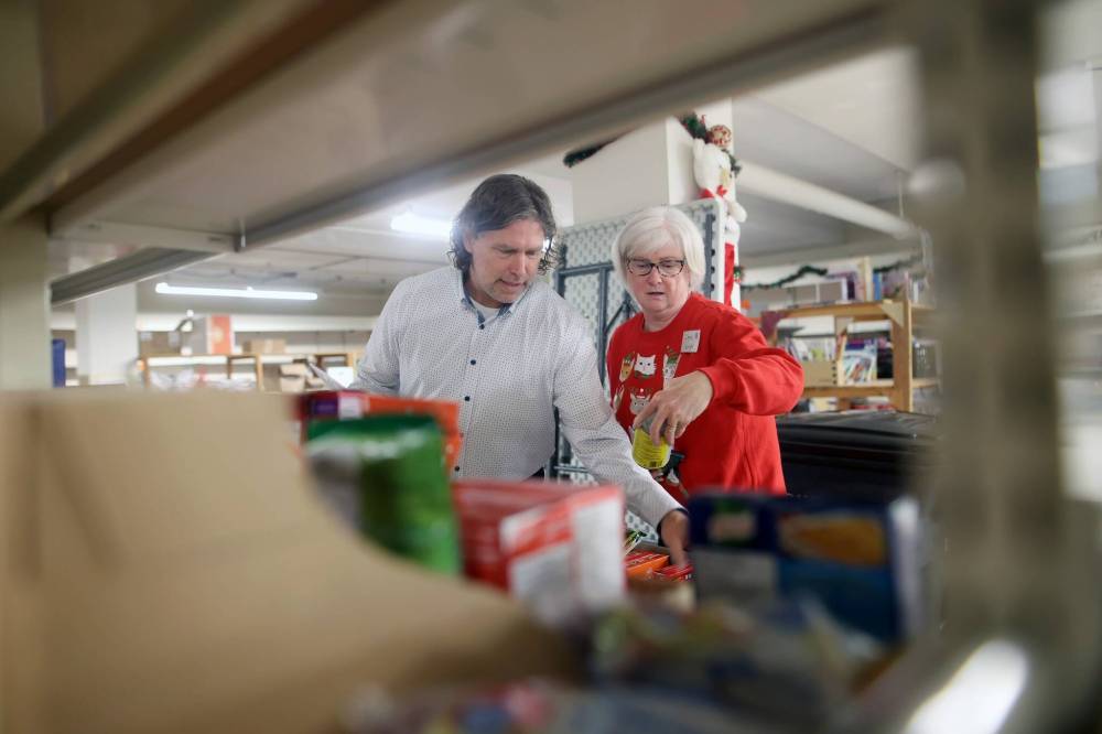 Synthia Wright, the Brandon-Westman Christmas Cheer Registry's media relations co-ordinator (right), is seen in this file photo with Brandon Mayor Jeff Fawcett during Christmas hamper preparations. Wright said the group was "absolutely shocked" when the province announced it would receive $500,000. (Tim Smith/The Brandon Sun files)