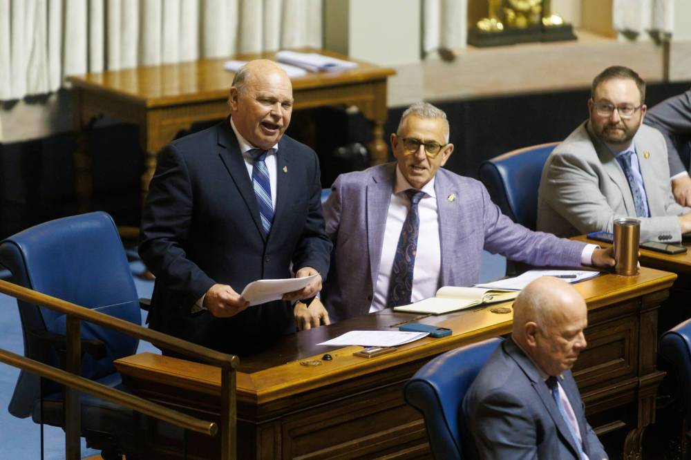 Swan River MLA Rick Wowchuk (left) speaks during question period in the legislature in this file photo. Wowchuk was scheduled to speak at a grand opening at Swan Valley Regional Secondary School on Saturday, but says he heard from the school division's board chair Friday evening that the premier's chief of staff told him Wowchuk