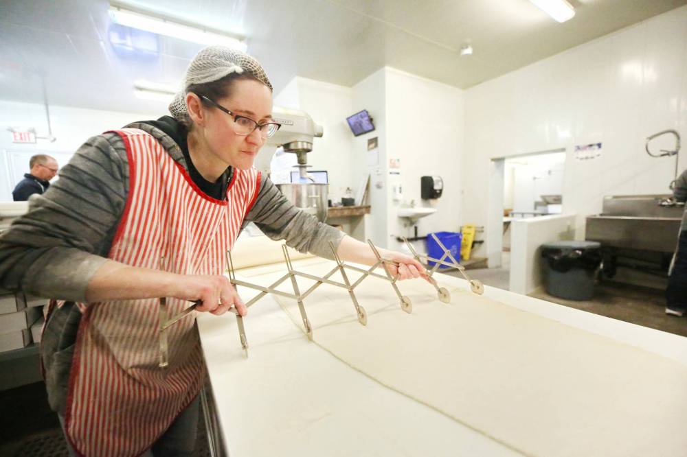 Baker Victoria Pichie, daughter of Henry Meats owner Norman Henry, uses a dividing tool on a sheet of dough to make sausage rolls on Wednesday for the Westman Multicultural Festival’s Scottish pavilion, which opens on Friday evening. (Matt Goerzen/The Brandon Sun)