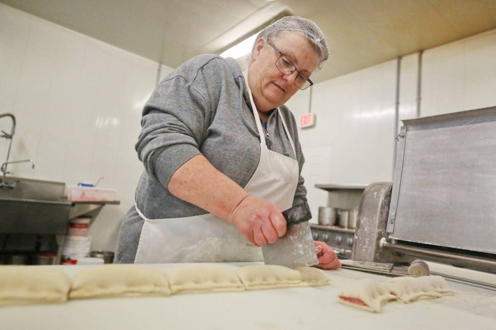 Bakers at the business, located just outside Brandon on Highway 270, were busy preparing large pans of sausage rolls and meat pies for the pavilion’s opening night, with bakers Victoria Pichie and Shelly Hillis busy piping meat onto long strips of dough, before pinching and cutting the dough to size.