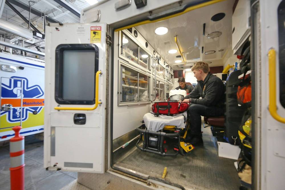 Firefighter/paramedics Brandon Halyk (left) and Nolan Fisher do an equipment check in the box of an ambulance at Brandon’s Fire Hall No. 1 on Thursday afternoon.