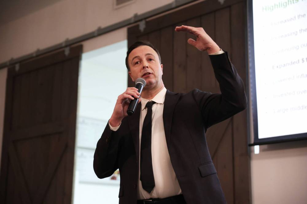 Finance Minister Adrien Sala opened the presentation at The Backyard on Aberdeen by acknowledging Manitobans’ priorities have been clear — fixing the health-care system, lowering the cost of living and making communities safer.