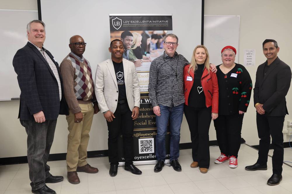 Brandon West MLA Wayne Balcaen (from left) joins Brandon University professor Balfour Spence, Loy Excellentia founder Aloy Anyichie, BU vice-president (academic) Greg Gatien, BU associate professor Burcu Ntelioglou, faculty of education dean Alysha Farrell and Westman Immigrant Services chief executive officer Enver Naidoo at Brandon University on Saturday afternoon as the Loy Excellentia Initiative hosted its annual Black History Month celebration. (Abiola Odutola/The Brandon Sun)