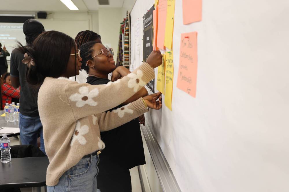 BU students write down challenges faced by international students and proposed solutions before posting them on a board during Saturday afternoon's event. (Abiola Odutola/The Brandon Sun)