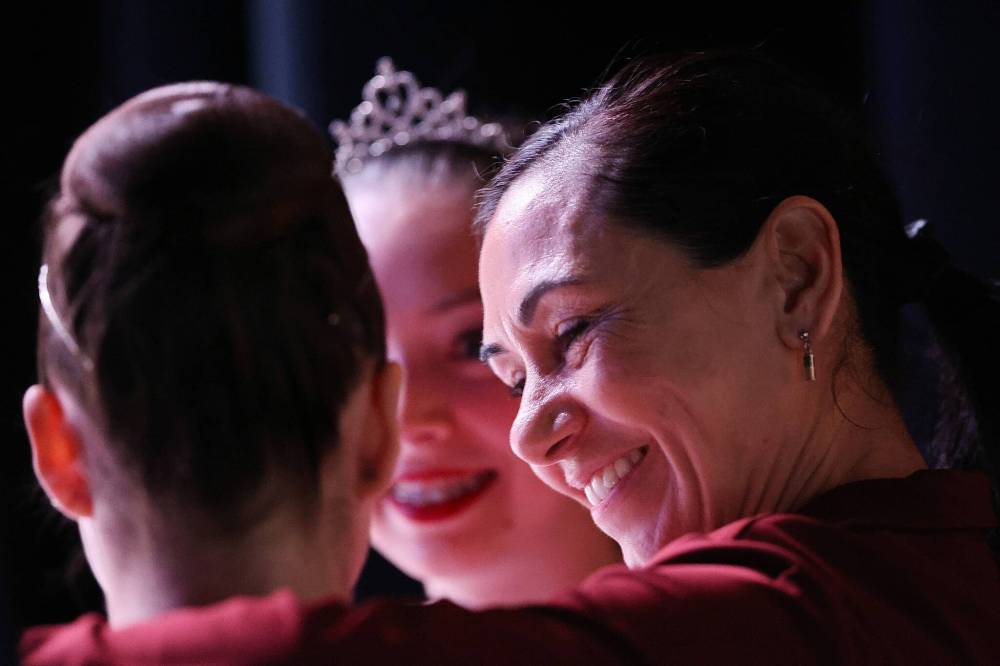 Brandon School of Dance head ballet instructor Alida Tromp spends a few moments huddled with her students, dancers Sienna Mercure and Julianna Veilleux, following their performance at the Western Manitoba Centennial Auditorium as part of the Brandon Festival of the Arts on Friday morning. (Matt Goerzen/The Brandon Sun)