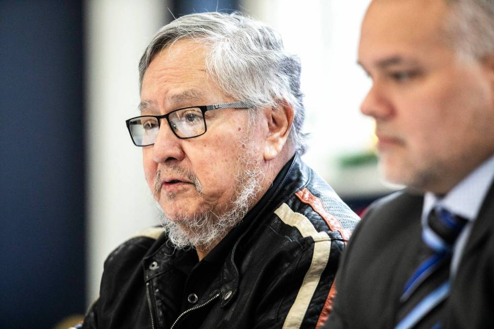 Dakota Tipi Chief Dennis Pashe (left) speaks to the media in 2025 (Mikaela MacKenzie/Winnipeg Free Press files).