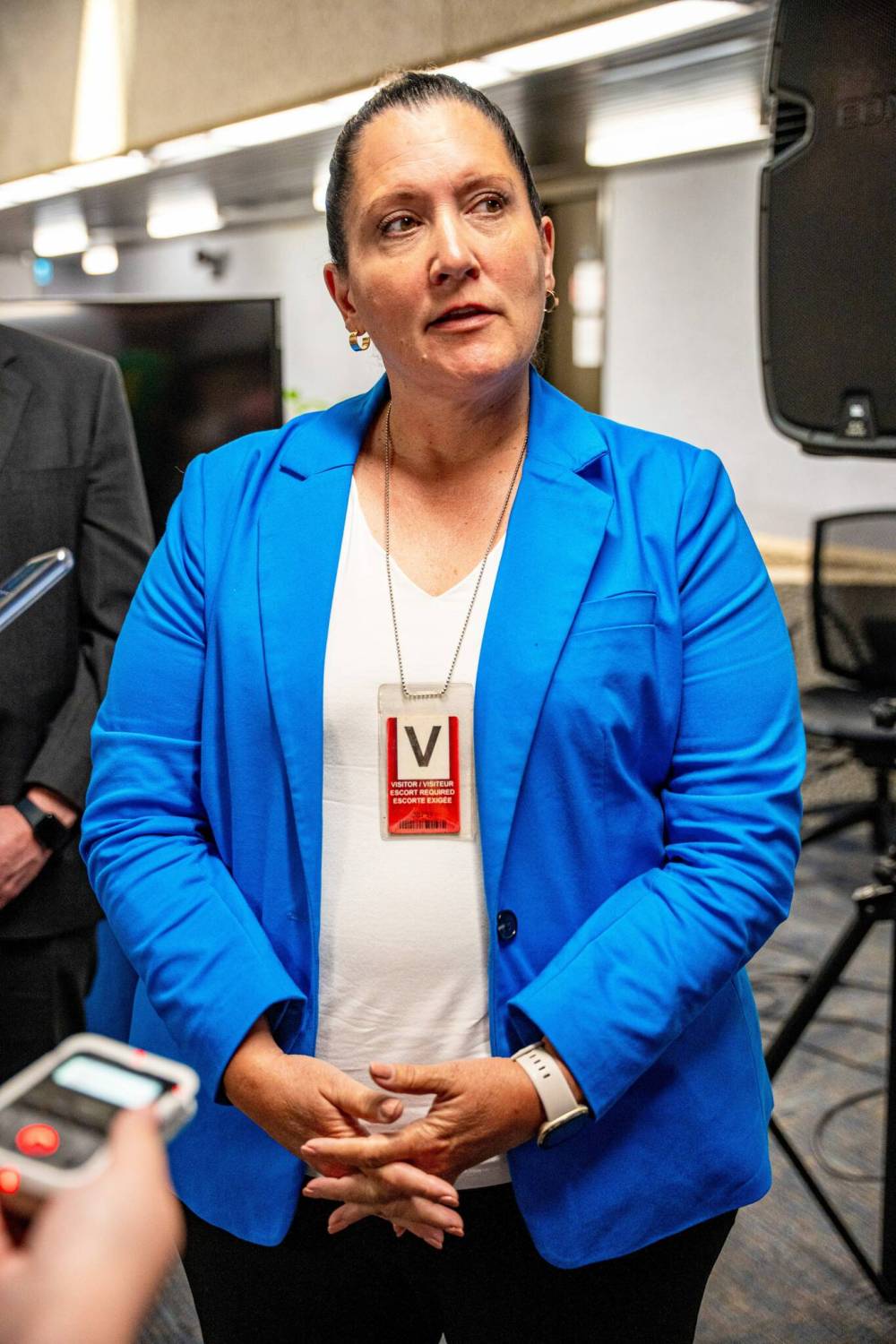 Portage la Prairie Mayor Sharilyn Knox speaks during a press conference at the Manitoba RCMP headquarters in a 2024 file photo. (Nic Adams/Winnipeg Free Press files)