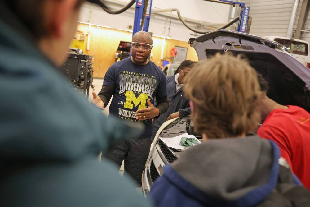 Kingsley Obamije, an automotive pre-employment student at Assiniboine College, talks to students about the automotive trades during Tuesday's trades summit. (Tim Smith/The Brandon Sun)