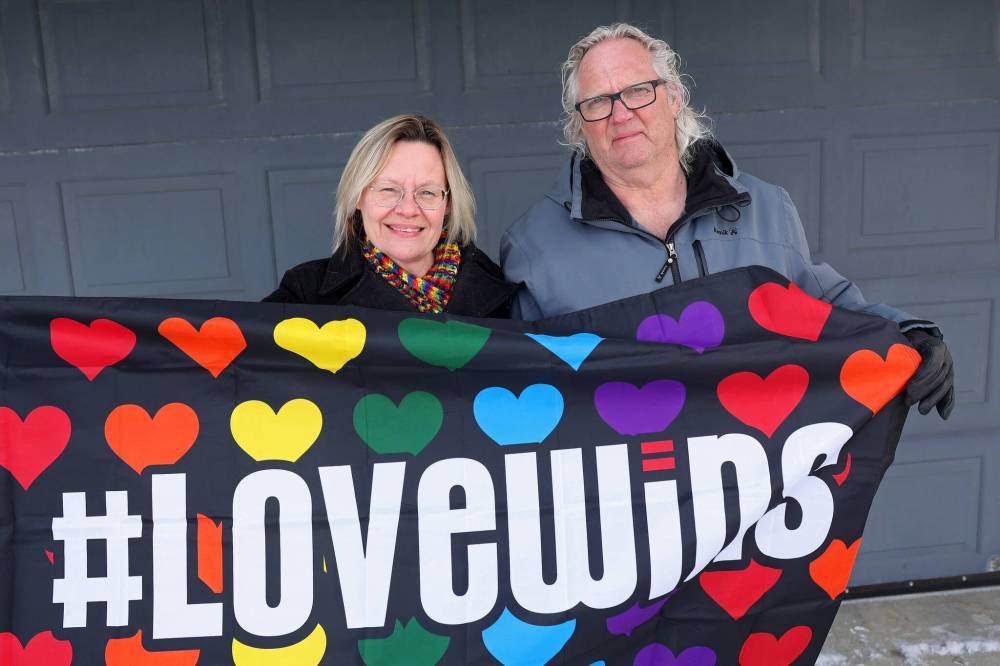 Karen Kempe and Harold Kuipers stand outside their home in Souris with her new #LOVEWINS rainbow flag on Wednesday. Kempe, a founding member of the Souris Pride Committee, and Kuipers have had the rainbow pride flag they display outside their home stolen three times, most recently this past Tuesday. (Tim Smith/The Brandon Sun)