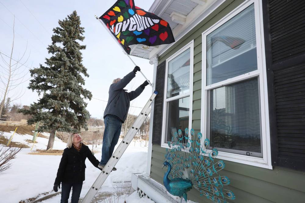 Karen Kempe and Harold Kuipers reinstall their new #LOVEWINS rainbow flag outside their home in Souris on Wednesday after taking it down for a photo. (Tim Smith/The Brandon Sun)