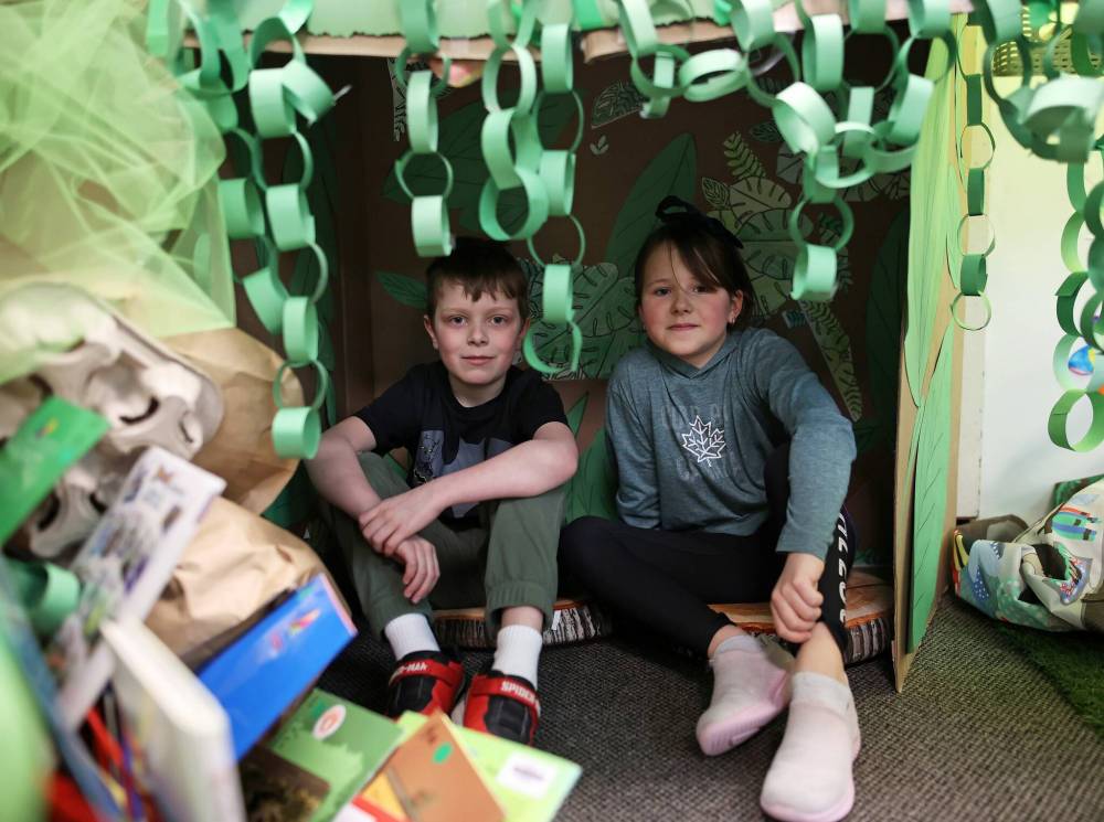 Grade 2 students Rogan Haigh and Rosalie Paquette sit in a cardboard rainforest at Riverheights School on Thursday. (Tim Smith/The Brandon Sun)