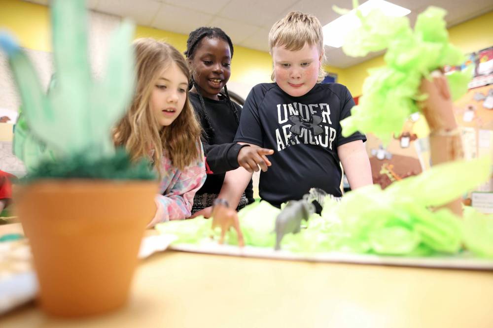 Grade 2 students Halle Haverstock, Michelle Esiekpe and Henry Higgins look over dioramas at Riverheights School while exploring one of the biomes created by the 62 Grade 2 students at the school along with about 20 Grade 4 students as part of a unit studying characteristics of animals. (Tim Smith/The Brandon Sun)