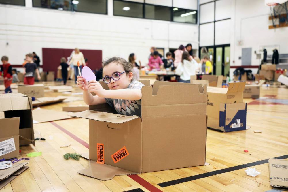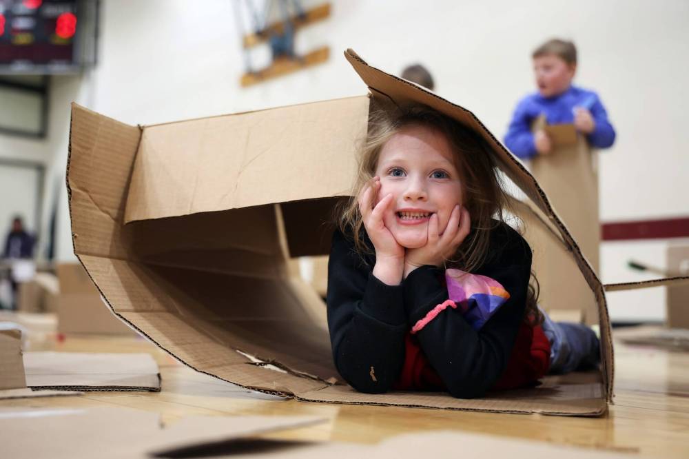 Emily Johnson, a Grade 1 student at Earl Oxford School, plays in a cardboard box while taking part in the challenge. (Tim Smith/The Brandon Sun)
