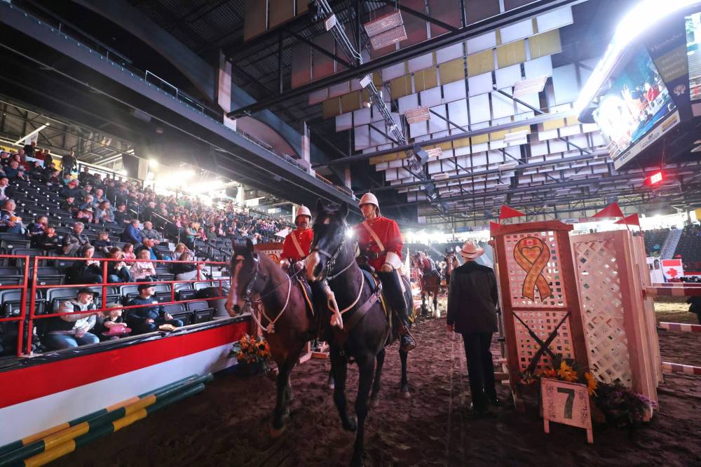 Riders dressed in the historic red serge of the Royal Canadian Mounted Police lead a horse team carrying evening sponsors at the Royal Manitoba Winter Fair at the Keystone Centre in Brandon. (Matt Goerzen/The Brandon Sun files)