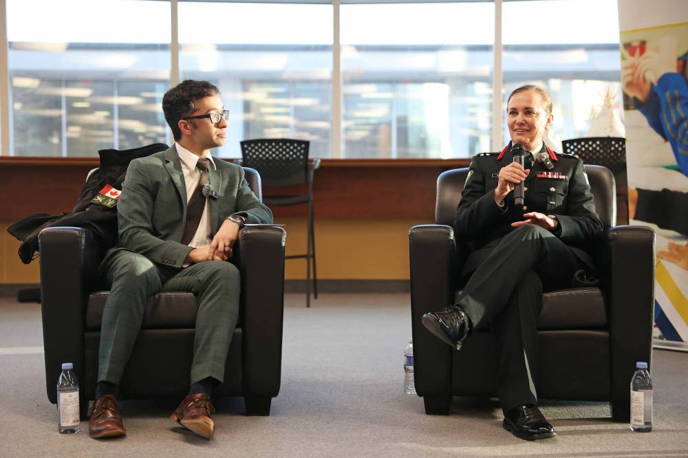 Christopher Hunt, a retired captain in the army reserve and instructor in political science at Brandon University, listens as Col. Evelyn Kotzer, commander of 38 Canadian Brigade Group, answers a question during an evening fireside chat on Thursday at BU. (Tim Smith/The Brandon Sun)