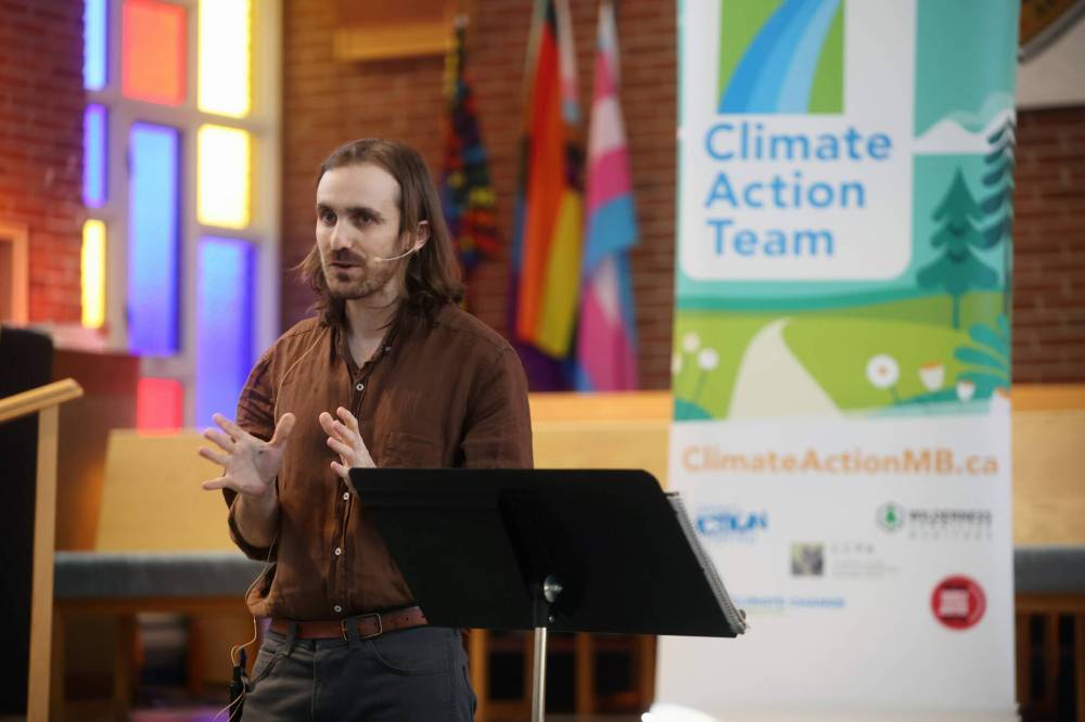 James Wilt, policy development manager with Climate Action Team Manitoba, speaks at Knox United Church on Thursday evening during an event hosted by CAT and Sustainable Brandon on the topic of new megaprojects in southwestern Manitoba. (Tim Smith/The Brandon Sun)
