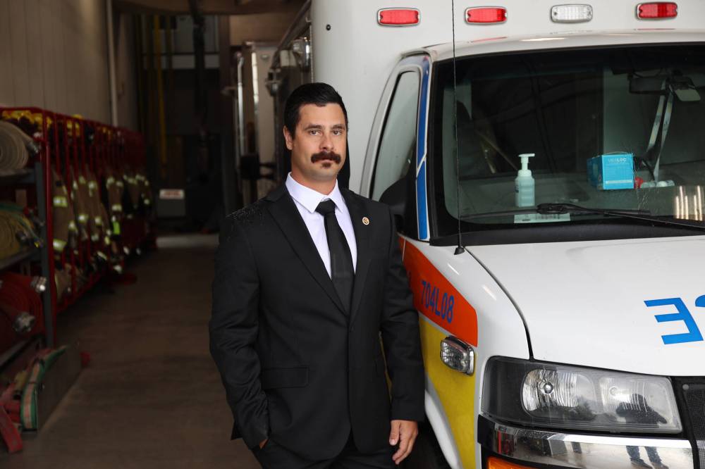 Brandon firefighter paramedic union president Gage Wood stands near an ambulance at a fire and emergency services station in Brandon in August 2025. (Abiola Odutola/The Brandon Sun files)