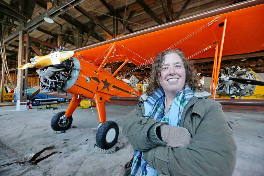 Commonwealth Air Training Plan Museum director general Zoe McQuinn poses in front of a 1943-built Boeing Stearman Kaydet, a recent addition to the historic hangar. The museum has issued a request for proposals for a huge project in the hopes of restoring and renovating the historic hangar and building an additional modern hangar for year-round exhibit restoration work. (Photos by Matt Goerzen/The Brandon Sun)